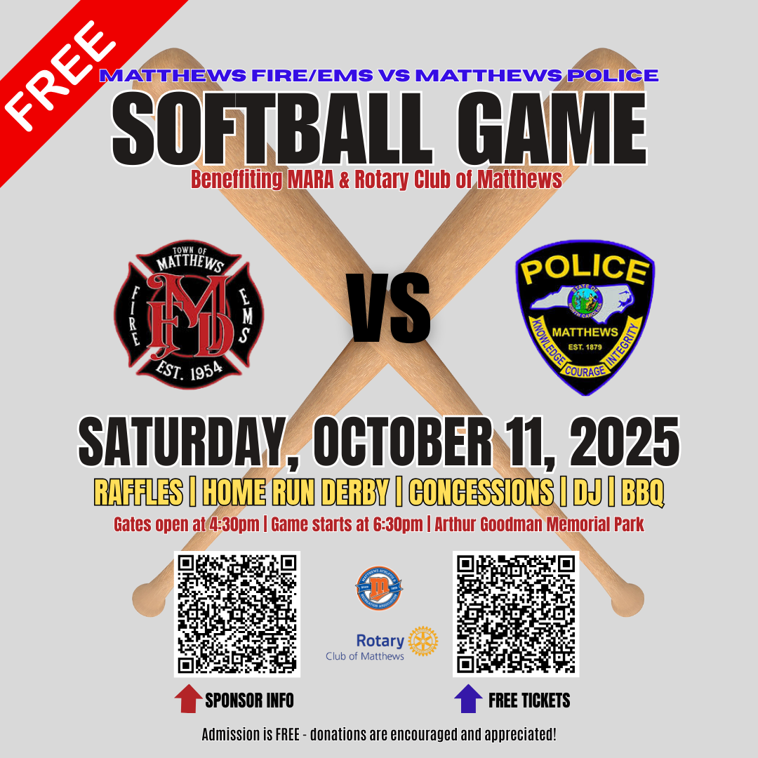Join us for a night of community, fun, and friendly competition as Matthews’ first responders take the field! MARA and the Rotary Club of Matthews will be hosting our First Annual Matthews Fire/EMS vs. Matthews Police Softball Game on Saturday, October 11, 2025, at Arthur Goodman Memorial Park.